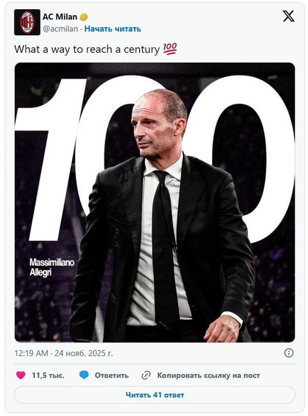 Аллегри достиг юбилейного количества побед, руководя Миланом