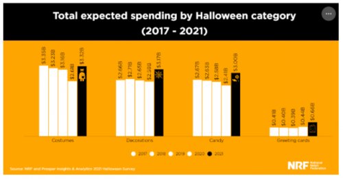 Общие ожидаемые расходы по категориям Хэллоуина (2017-2021) В опросе, который проводился с 1 по 8 сентября, приняли участие свыше 8 000 американцев.