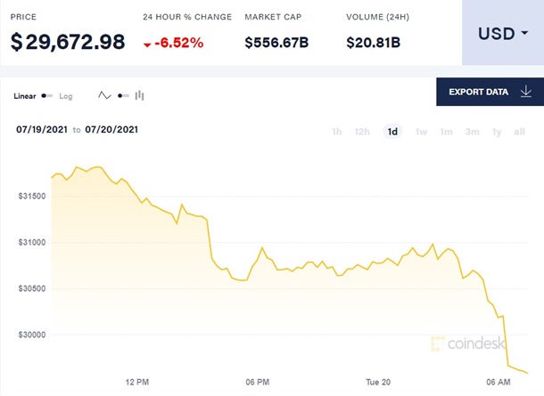 Самая популярная криптовалюта биткоин существенно потеряла в цене, опустившись ниже психологической отметки в 30 тысяч долларов. Об этом сообщает CoinDesk во вторник, 20 июля.Так, по состоянию на 7:45 по Киеву цена биткоина упала на 6,52% и достигла уровня 29 672 долларов.