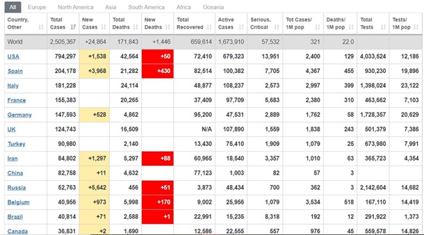 Количество зараженных коронавирусом COVID-19 в мире во вторник, 21 апреля, превысило 2,5 миллиона человек, свидетельствуют данные сайта Worldometer.Общее количество зараженных коронавируса в мире достигло 2505367 человек, умерло - 171 7843 человек, выздоровели - 659 614 пациентов.