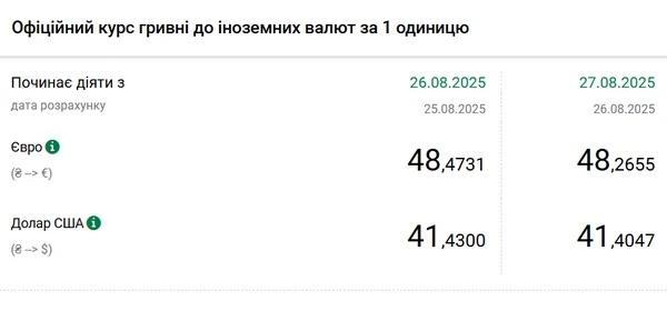 Официальный курс на 27 августа 2025 года установлен на таком уровне: 41,4047 гривен за 1 доллар (-0,0253 грн).