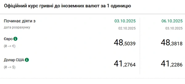 Официальный курс на 6 октября 2025 года установлен на таком уровне: 41,2286 гривен за 1 доллар (-0,0478 грн).