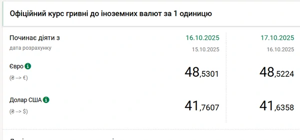 Официальный курс на 17 октября 2025 года установлен на таком уровне: 41,6358 гривен за 1 доллар (+0,0093 грн).