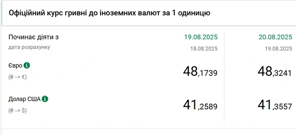 Официальный курс на 20 августа 2025 года установлен на таком уровне: 41,3557 гривен за 1 доллар (+0,0968 грн).