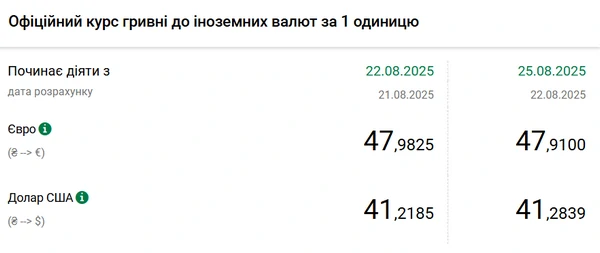 Официальный курс на 25 августа 2025 года установлен на таком уровне: 41,2839 гривен за 1 доллар (+0,0654 грн).