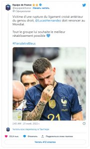 В первом тайме защитник "трехцветных" Лукас Эрнандес получил травму, из-за которой был заменен. Как сообщает пресс-служба сборной, у 26-летнего футболиста серьезная травма - разрыв крестообразной связки. Таким образом футболист пропустит не только ЧМ-2022, но скорее всего, выбыл из игры на долгий период.