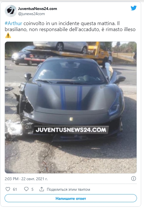 Сообщается, что 25-летний бразилец не является виновником аварии и не пострадал, однако Феррари, за рулем которого ехал игрок, получил довольно серьезные повреждения. Артур перешел в Ювентус из Барселоны в июне 2020 года. Сумма трансфера составила около 80 млн евро.