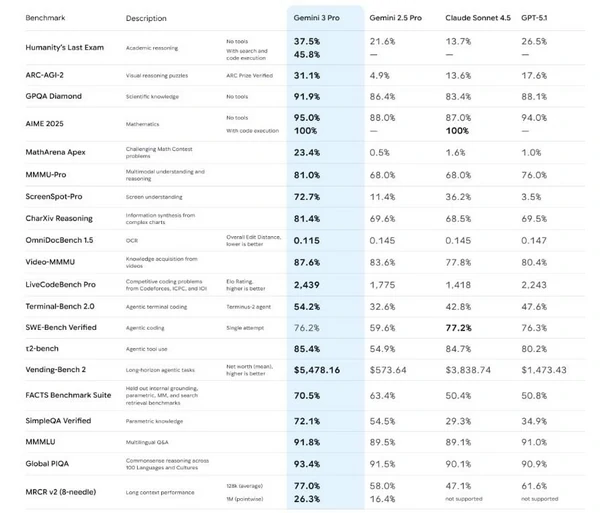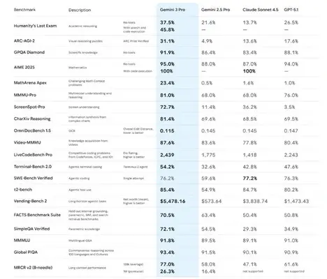 Как утверждает Google, Gemini 3 Pro заметно опережает Gemini 2.5 Pro во всех бенчмарках. Модель лучше справляется со сложными задачами, точнее выхватывает контекст и формулирует ответы под реальную суть запроса, а не поддакивает пользователю и выдаёт то, что хочет слышать человек.