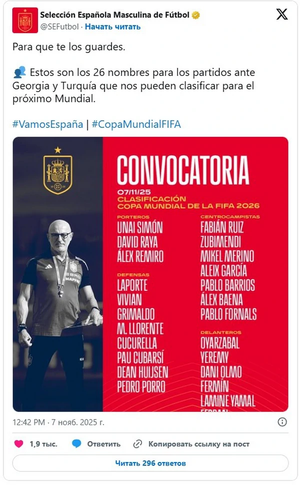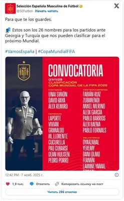 На следующей неделе стартуют матчи квалификации к Чемпионату мира. На официальной странице в социальной сети X сборная Испании опубликовала список игроков, которые будут участвовать в финальных матчах отбора к чемпионату мира.