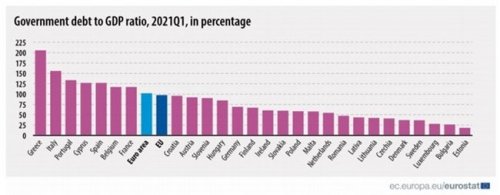 Самое высокое соотношение госдолга к ВВП на конец первого квартала 2021 года зафиксировали в Греции (209,3%), Италии (160,0%), Португалии (137,2%), Кипре (125,7%), Испании (125,2%), Бельгии (118,6%) и Франции (118,0%), а самый низкий в Эстонии (18,5%), Болгарии (25,1%) и Люксембурге (28,1%).