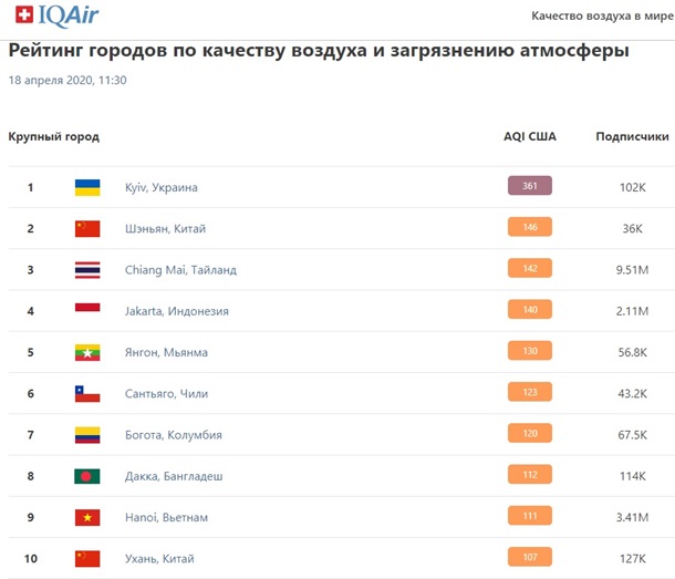 Сейчас столица Украины является самым грязным городом в мире. Киев намного опережает китайский Шэньян (146 баллов) и Чиангмай в Таиланде (142).