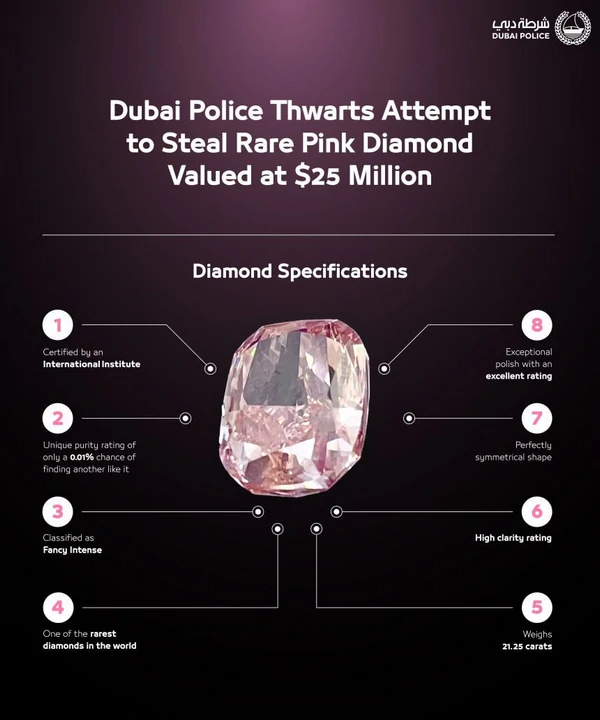 В Дубае полиция успешно раскрыла громкое ограбление, во время которого был похищен чрезвычайно редкий розовый бриллиант стоимостью 25 миллионов долларов. Об этом во вторник, 19 августа, сообщило издание CNN.