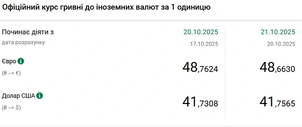 Официальный курс на 21 октября 2025 года установлен на таком уровне: 41,7565 гривен за 1 доллар (+0,0257 грн).