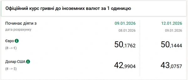 Официальный курс доллара на 12 января 2026 года установлен на таком уровне: 43,0757 гривен за 1 доллар (+0,09 грн).