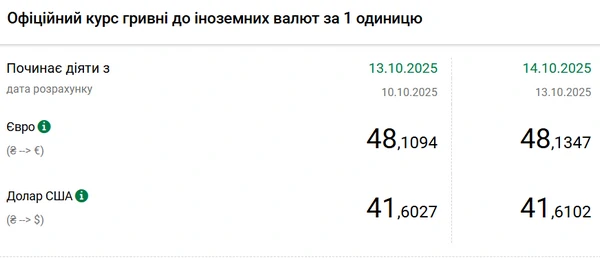 Официальный курс на 14 октября 2025 года установлен на таком уровне: 41,6102 гривен за 1 доллар (+0,0075 грн).