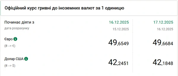 Официальный курс доллара на 17 декабря 2025 года установлен на таком уровне: 42,1848 гривен за 1 доллар (-0,06 грн).