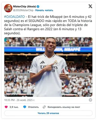 Нападающий мадридского Реала Килиан Мбаппе совершил один из самых быстрых хет-триков.