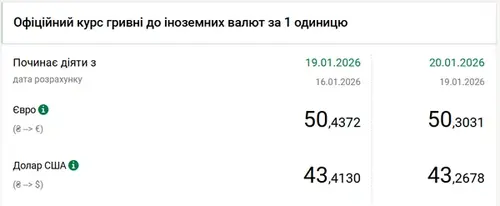 Официальный курс доллара на 20 января составил 43,27 гривен, что на 15 копеек ниже значения 19 января.