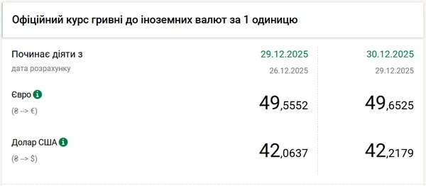 Официальный курс доллара на 30 декабря 2025 года установлен на таком уровне: 42,2179 гривен за 1 доллар (+0,15 грн).