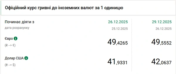 Официальный курс доллара на 29 декабря 2025 года установлен на таком уровне: 42,0637 гривен за 1 доллар (+0,13 грн).