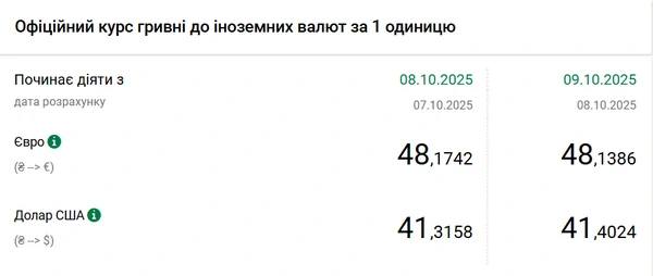 Официальный курс доллара на 9 октября 2025 года установлен на таком уровне: 41,4024 гривен за 1 доллар (+0,09 грн).