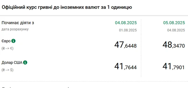 Официальный курс на 5 августа 2025 года установлен на таком уровне: 41,7901 гривен за 1 доллар (+0,0257 грн).