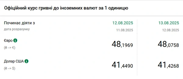 Официальный курс доллара на 13 августа 2025 года установлен на таком уровне: 41,4268 гривен за 1 доллар (-0,0222 грн).