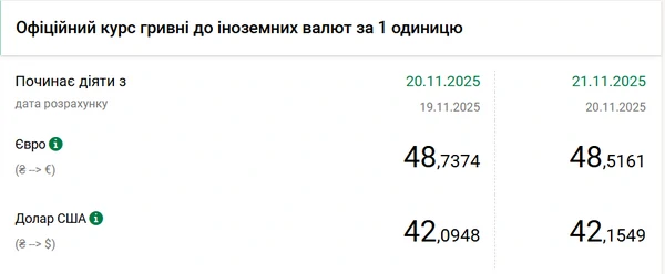 Официальный курс доллара на 21 ноября 2025 года установлен на таком уровне: 42,1549 гривны за 1 доллар.