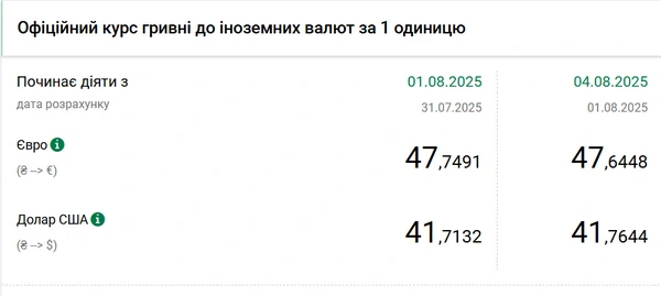 Официальный курс на 4 августа 2025 года установлен на таком уровне: 41,7644 гривен за 1 доллар (+0,0512 грн).