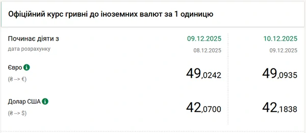 Официальный курс доллара на 10 декабря 2025 года установлен на таком уровне: 42,1838 гривен за 1 доллар (+0,11 грн).