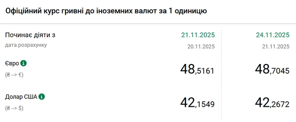 Официальный курс доллара на 24 ноября 2025 года установлен на таком уровне: 42,2672 гривны за 1 доллар. С начала года доллар подорожал на 24 копейки: 1 января 2025 года он стоил 42,02 грн. С начала ноября рост американской валюты составил 29 копеек – в первый день месяца курс был на уровне 41,97 гривны за доллар.