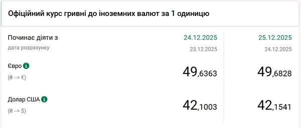 Официальный курс доллара на 25 декабря 2025 года установлен на таком уровне: 42,1541 гривен за 1 доллар (+0,05 грн).