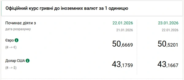 Курс доллара на 23 января установлен на уровне 43,1667 гривен (-0,01 гривен к предыдущему дню).