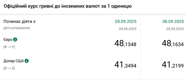 Официальный курс на 8 сентября 2025 года установлен на таком уровне: 41,2199 гривен за 1 доллар (-0,1295 грн). Ниже курс был только 22 августа (41,2185 грн/доллар), когда он находился на минимальном уровне с начала апреля.