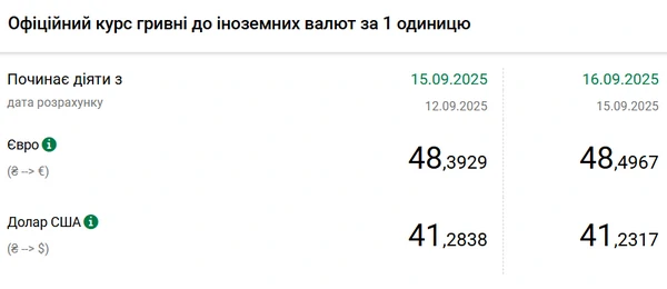 Официальный курс на 16 сентября 2025 года установлен на таком уровне: 41,2317 гривен за 1 доллар (-0,0521 грн).