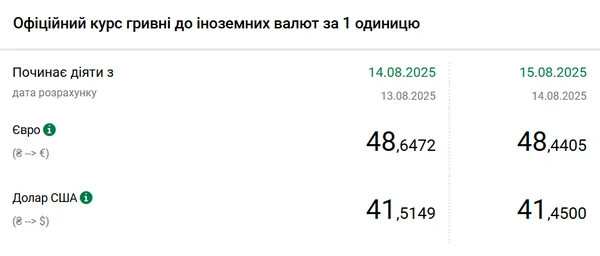 Официальный курс доллара на 15 августа 2025 года установлен на таком уровне: 41,45 гривен за 1 доллар (-0,0649 грн).