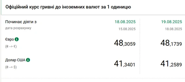 Официальный курс на 19 августа 2025 года установлен на таком уровне: 41,2589 гривен за 1 доллар (-0,0812 грн). Это минимальный уровень с 9 апреля (41,174 гривен).