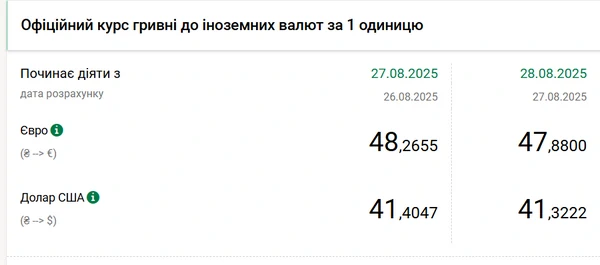 Официальный курс на 28 августа 2025 года установлен на таком уровне: 41,3222 гривен за 1 доллар (-0,0825 грн).