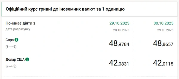 Официальный курс доллара на 30 октября 2025 года установлен на таком уровне: 42,0115 гривны за 1 доллар (-0,07 грн).