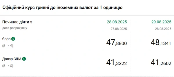 Официальный курс на 29 августа 2025 года установлен на таком уровне: 41,2602 гривен за 1 доллар (-0,0620 грн).