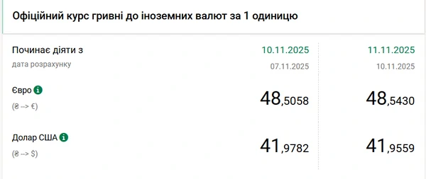 Официальный курс доллара на 11 ноября 2025 года установлен на таком уровне: 41,9559 гривны за 1 доллар (-0,02 грн).