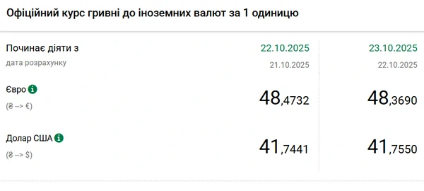 Официальный курс на 23 октября 2025 года установлен на таком уровне: 41,755 гривен за 1 доллар (+0,0109 грн).