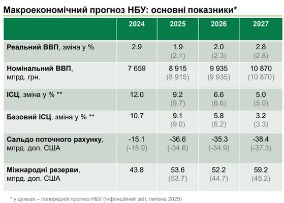 По прогнозу НБУ, в 2026 году экономика вырастет на 2,0% (предыдущий прогноз - 2,3%), в 2027 году ВВП увеличится на 2,8% (предыдущий прогноз - 2,8%).