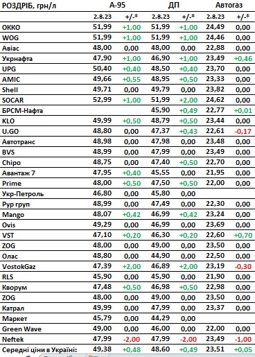 По данным мониторинга, средние розничные цены на бензин А-95 составляют 49,38 гривен за литр (+0,48 гривен), на дизельное топливо 48,60 гривен за литр (+0,49гривен), на автогаз 23,51 гривен за литр (+0,05 гривен).