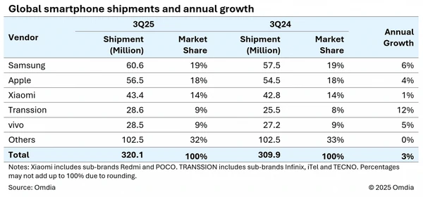 Интересно, что именно Transsion заняла лидирующее место как самый быстрорастущий бренд смартфонов среди пяти лучших в 2025 году. Он зафиксировал рост на 12% в годовом исчислении и поднялся на четвертое место, отгрузив 28,6 миллиона единиц, в то время как рост Samsung и Apple составил 6% и 4% соответственно.