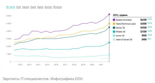 Второе полугодие 2021 года оказалось рекордным по росту зарплат украинских IT-специалистов. Об этом стало известно из опроса разработчиков всех уровней, который в декабре 2021 года провел сайт DOU. В этот период медианные зарплаты архитекторов пересекли отметку $6000 – это на 10% больше, чем в прошлом полугодии. Тимлиды и техлиды имеют $5000, тогда как сеньор-специалисты – $4500. Медиана мидлов – $2500. Но по отдельным направлениям и языкам она уже достигла $3000.