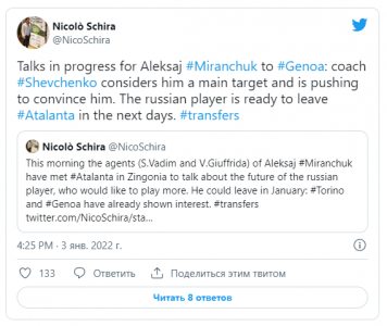 Похоже, что полузащитник сборной России и Аталанты Алексей Миранчук может в скором времени сменить один итальянский клуб на другой.Как сообщает журналист Николо Скира, игрока очень хочет видеть в составе Дженоа главный тренер Андрей Шевченко.
