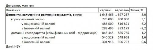 Депозитный портфель банков в сентябре вырос на 3,0% до 1 698 млрд гривен, в т.ч. населения вырос на 1,2% до 856 млрд гривен, предприятий вырос на 3,1% до 800 млрд гривен.