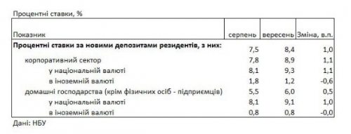 В сентябре 2022 года ставки по гривневым депозитам для предприятий выросли с 8,1% до 9,3% годовых, по валютным упали с 1,8% до 1,2% годовых.