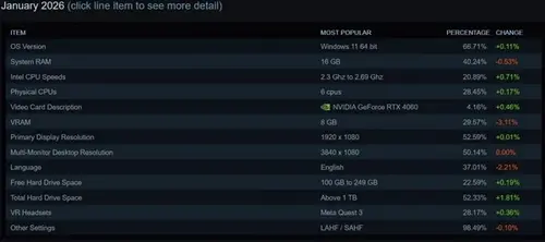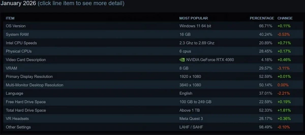 Steam показал среднестатистический компьютер ПК-геймера в 2026 году